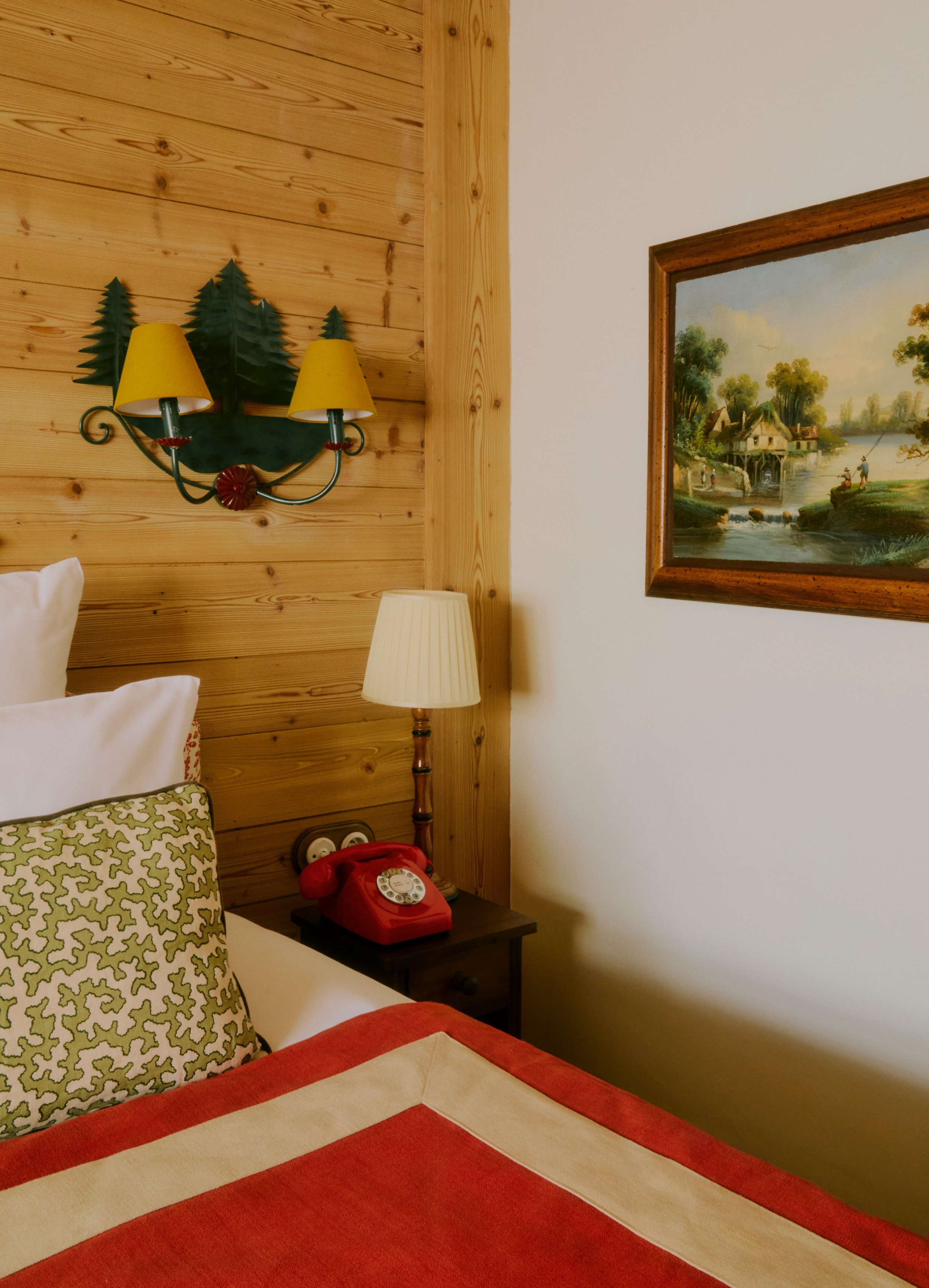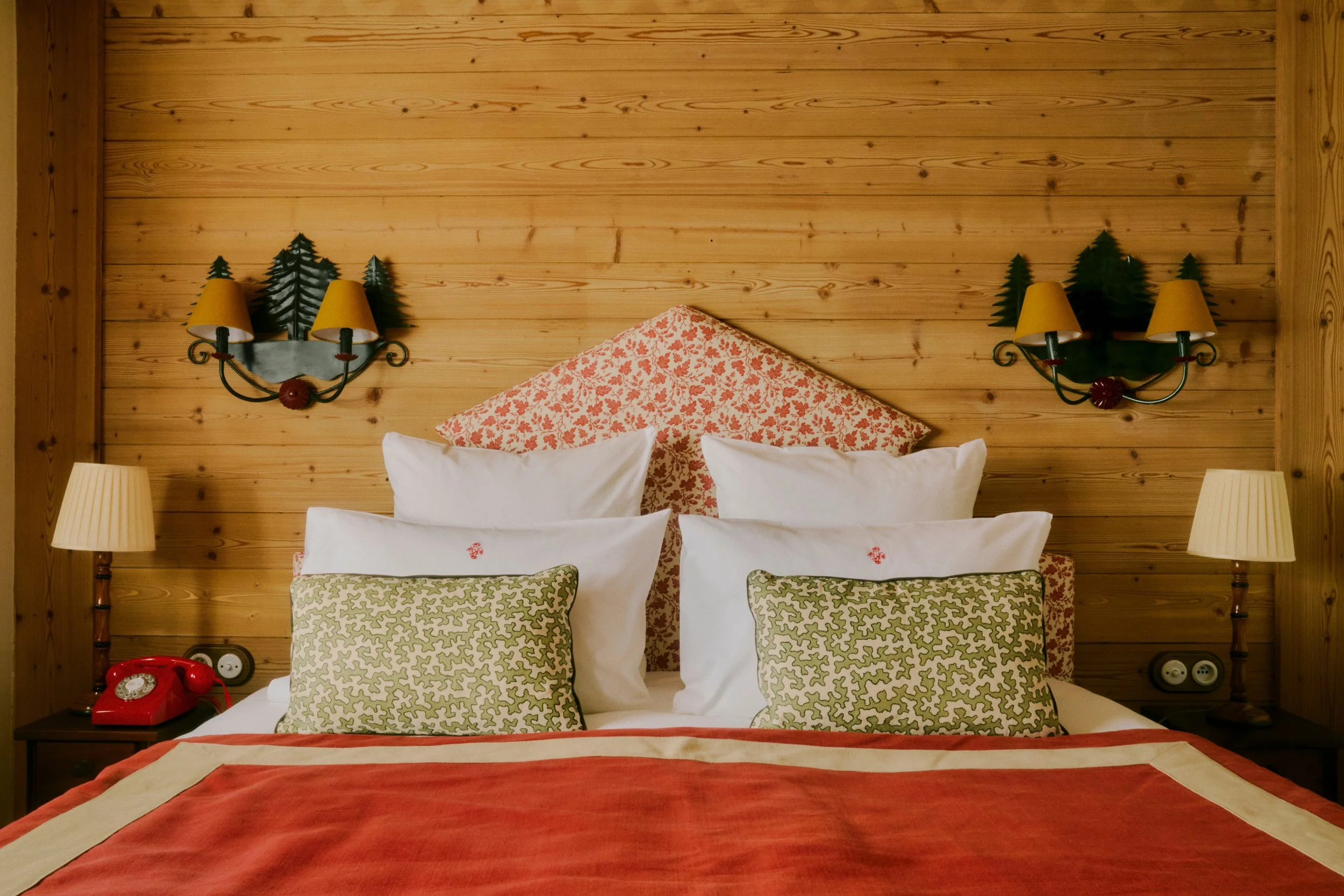 Petits cocons alpins, situés en rez-de-chaussée ou au premier étage, elles conservent la mémoire des hivers passés dans leurs murs de bois patiné. Les tissus Christopher Moore, aux motifs de chêne et de glands, habillent les têtes de lit. Sous les pieds, une moquette d’edelweiss rappelle les prairies alpines. Les salles de bains sont habillées de carreaux inspirés de modèles anciens. Vue sur le village, le clocher ou les montagnes. Un refuge simple et poétique, idéal pour s’imprégner de l’atmosphère de Megève.